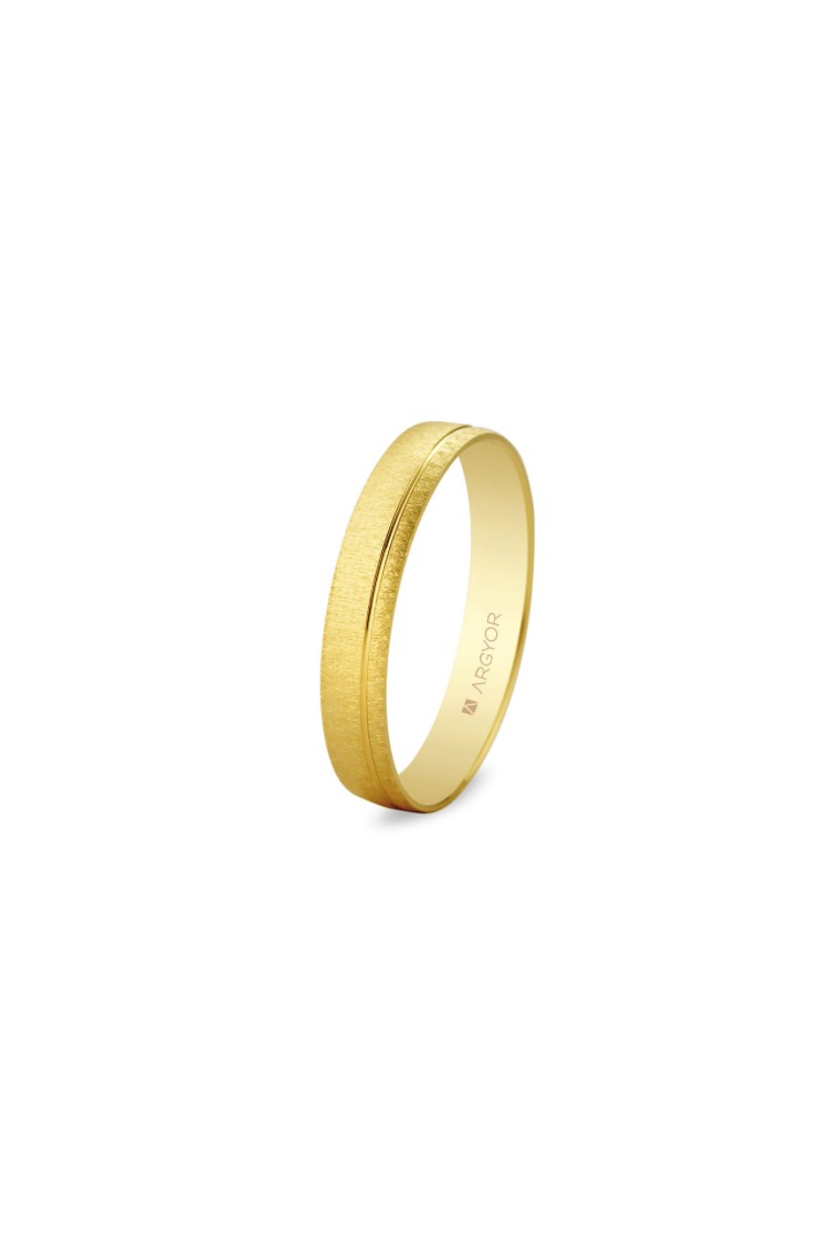 ALIANZA ORO AMARILLO 18K CON ACABADO MATE RUGOSO Y UN FINO BISEL EN BRILLO. 3,5 MILÍMETROS.
